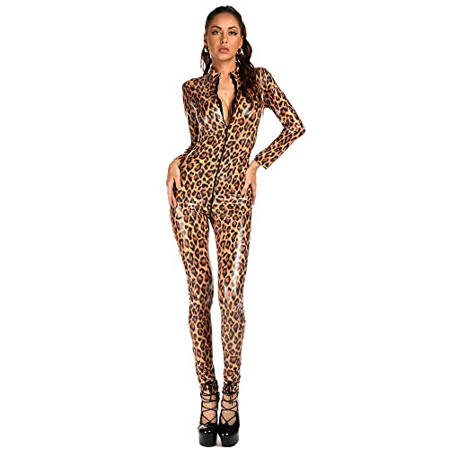 YEMYIQZ Women Sexy Jumpsuit PU Leopard Bodysuit Faux Leather Tight Slim Fit Catsuit Zipper Long Sleeve One Piece Outfit Clubwear (Leopard, M)